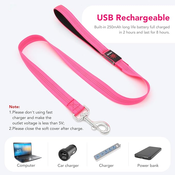 - Paired for use- LED dog leash + LED dog collar , can make your dog easier to spot at night when walking your dog at night.(Use only 5V USB adapter)