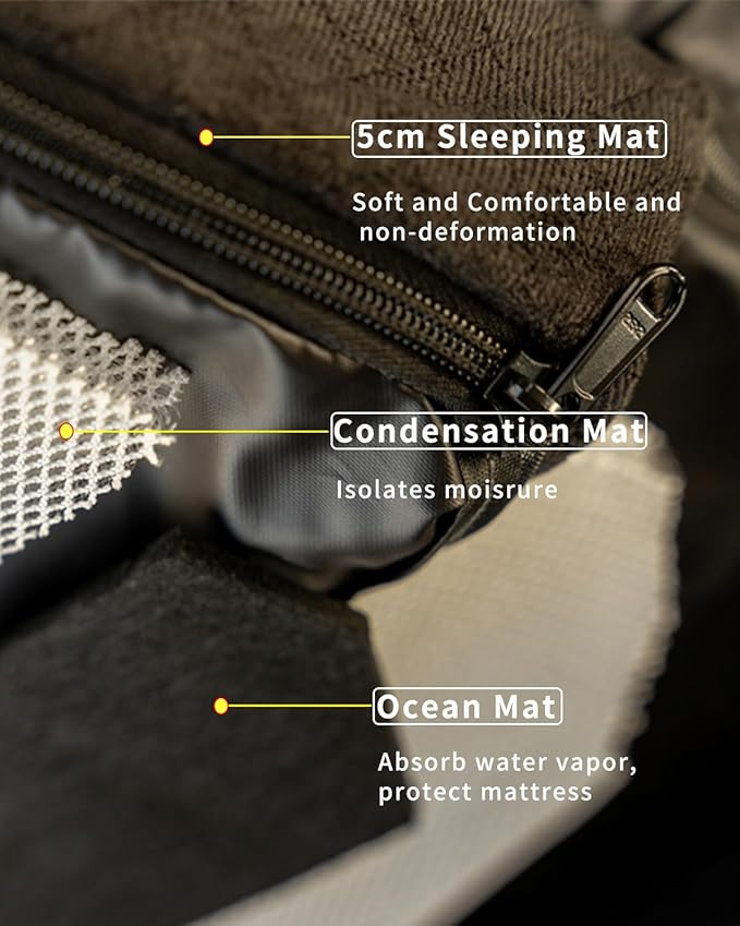 - Comfortable Mattress & Bottom Oak Board: The Naturenest rooftop tent is equipped with a 5cm non-deformable soft mattress, providing a comfortable sleeping environment; the bottom oak board enhances the safety and comfort of the tent. The Car roof tent is equipped with condensation pads and marine pads, which prevent moisture condensation and effectively absorb moisture to protect the interior of the tent.