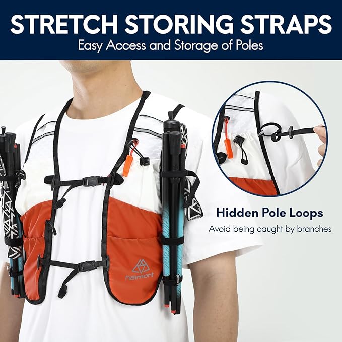 - IDEAL FOR OUTDOOR ACTIVITY: 5 L outdoor running vest with dual 500ml soft water bottles has lots of storage options, and allows you quick hydration at any time. (Trekking pole are not included) Haimont running hydration vest aims to accompany your trip of running, hiking, climbing, racing, trail, all-terrain races, etc