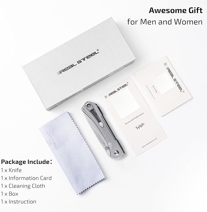 - HIGH-QUALITY MATERIALS AND CRAFTSMANSHIP: The REALSTEEL SYLPH pocket knife features a 3.07" blade, the weight is 3.35oz, the blade is made of durable Nitro-V steel with a hardness of 58-59 HRC, providing exceptional corrosion resistance, superior edge retention, and effortless cutting performance