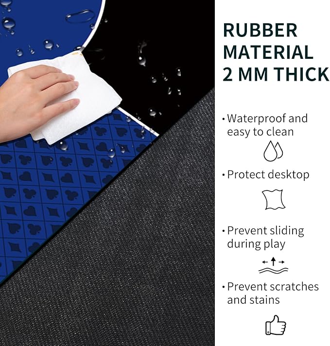 - 【POKER MAT FOR 6-8 PLAYER】The poker table mat with eye-catching colors, it could take you enjoyable casino theme party or card gaming night.Made of high-quality rubber, our mat will last a long playtime and be easy to clean. No worries about spilled water, drinks, ink, or other liquid, just wipe the hold'em poker top with a wet cloth or paper.