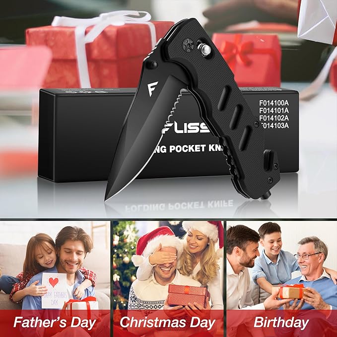 FLISSA Folding Pocket Knife with Clip, Glass Breaker and Seatbelt Cutter, Survival Knife for Emergency Rescue Situations, EDC Knife for Tactical, Hunting, Camping, Outdoor, Unique Gifts for Dad, Father-Black