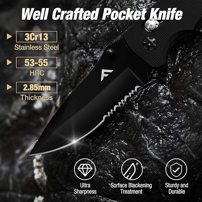 - Wide Applications: Glass breaker, seatbelt cutter, and blade serrations are ready for any emergency. With a convenient pocket clip, you can carry this folding knife for survival, tactical, camping, hiking, fishing, and any outdoor activity