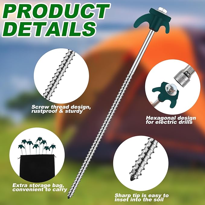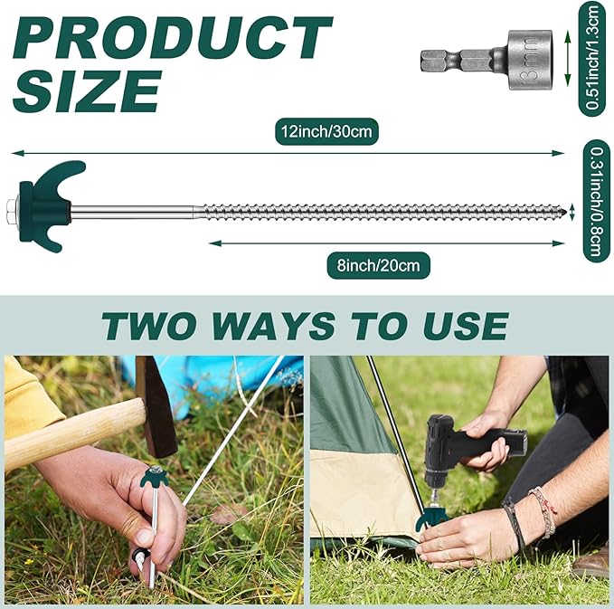 - Package Includes: the package includes 20 pieces of threaded camping stakes and 1 piece of 0.51 inch diameter hex head driver, enough quantity to meet your applying needs and replacement needs; The tent stakes are approx. 12 inch/ 30 cm long, the thread is approx. 8 inch/ 20 cm long and approx. 0.31 inch/ 0.8 cm in diameter; Plenty to meet most of your wilderness camping needs