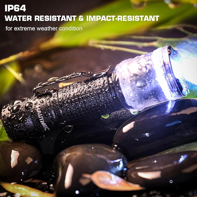- IP64 WATER RESISTANT DESIGN - The IP64 dust and water resistance rating means it is perfect to use in wet condition, light rain day or tough day. Made from anti-slip aluminum, it can resist scratching and hard enough in tough. Ideal for camping, hunting, dog walking, power outage and other outdoor activities.