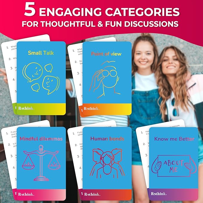 - 5 CONVERSATION THEMES: a variety of conversation cards include Small Talk, Point of View, Human Bonds, Mindful Dilemmas, and Know Me Better
