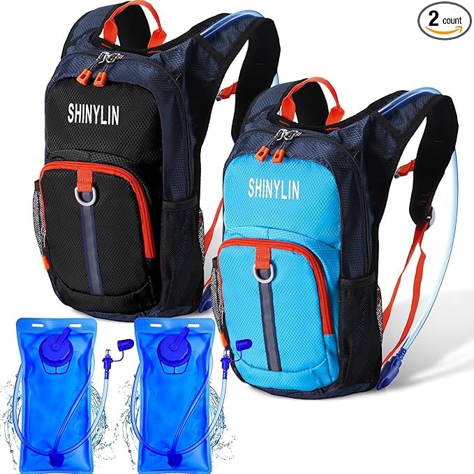 - 2 Sets of Lightweight Hydration Backpacks: you will receive 2 hydration backpacks and 2 pieces of 1.5L hydration bags; Each hydration pack for kids is equipped with a safety whistle and reflective strip design, and is equipped with 2 large storage compartments and 2 pockets, allowing children to store different supplies