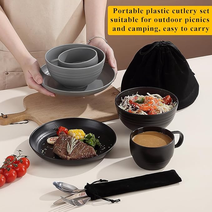 - Camping utensils set includes: 2 dinner knife, 2 dinner fork, 2 dinner spoon, 2 plastics cups, 2 plastics plates and 2 plastics bowls.