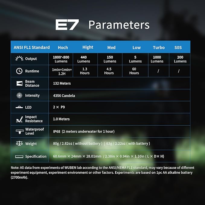 - 【Super Bright 6 MODES 】: WUBEN E7 rechargeable flashlights have 6 lighting modes: High/Med/Low/Super Bright/Strobe/SOS, with memory function;Click the switch and long press to trigger the gear selection; double click to light up the super bright mode; three clicks to burst flash mode; four consecutive clicks to lock the flashlight,Avoid turning on the flashlight by accidental touch;
