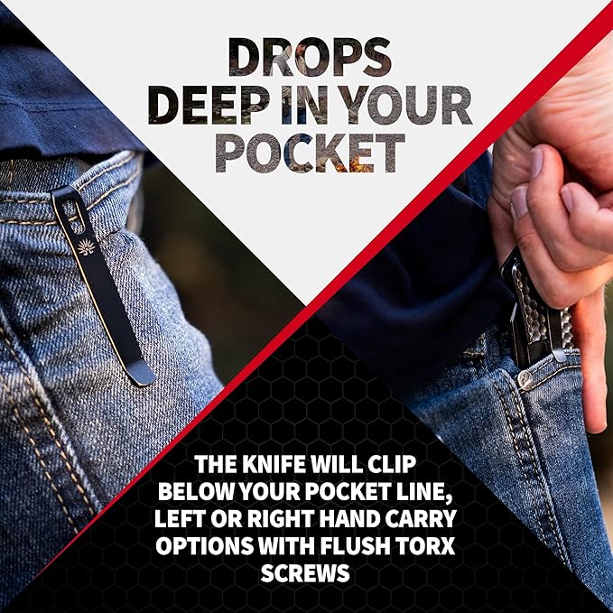 - šDEEP CARRY TITANIUM POCKET CLIP: The Mamba V3 features a titanium deep carry pocket clip for maximum discretion and durability. Its low-profile design keeps the knife secure and nearly invisible in your pocket. Titaniumās strength and lightweight properties ensure resilience against bending or breaking, even with daily use. Flush-mounted countersunk screws prevent snagging and enhance the sleek, streamlined look. This clip is perfect for those who want a reliable, low-profile carry without sacrificing toughness or performance.
