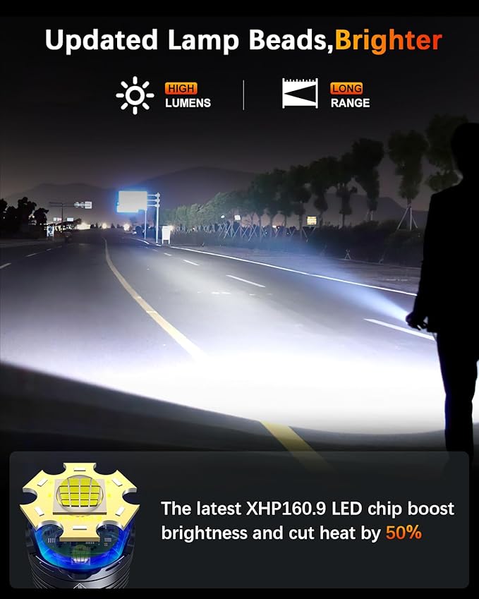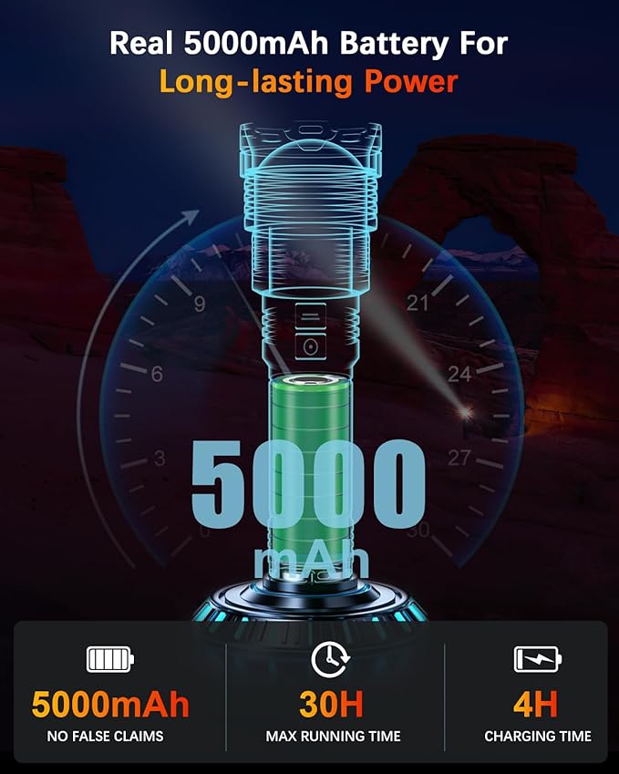 - đĄ2000.001 High Lumens & Powerful Battery: The Grentay rechargeable high lumen flashlight delivers 2000.001LM--an unparalleled brightness. Equipped with the latest XHP160.9 LED chip and 5000mAh battery, it provides a runtime up to 30 hours. Whether youâre walking along rugged mountain trails, camping under the stars, or exploring the vast outdoor world, this powerful bright flashlight is your reliable companion for long-distance adventures.