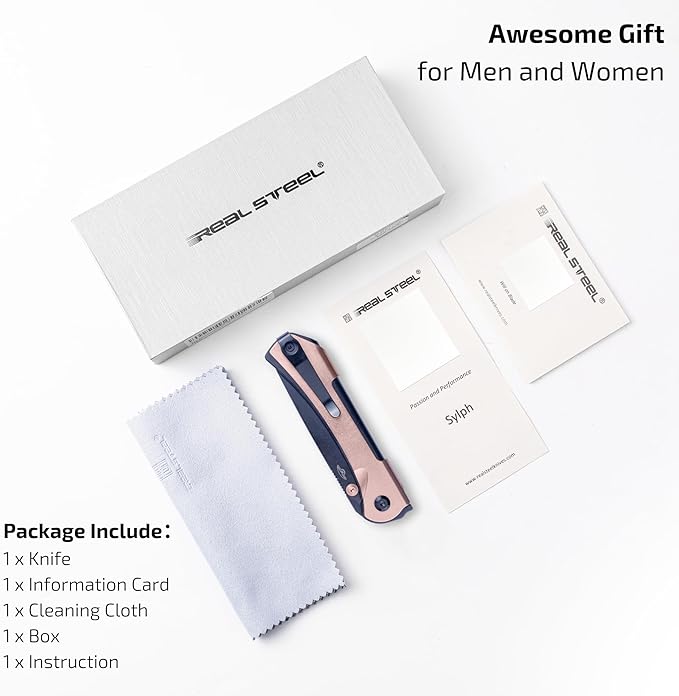 - HIGH-QUALITY MATERIALS AND CRAFTSMANSHIP: The REALSTEEL SYLPH pocket knife features a 3.07" blade, the weight is 3.35oz, the blade is made of durable Nitro-V steel with a hardness of 58-59 HRC, providing exceptional corrosion resistance, superior edge retention, and effortless cutting performance
