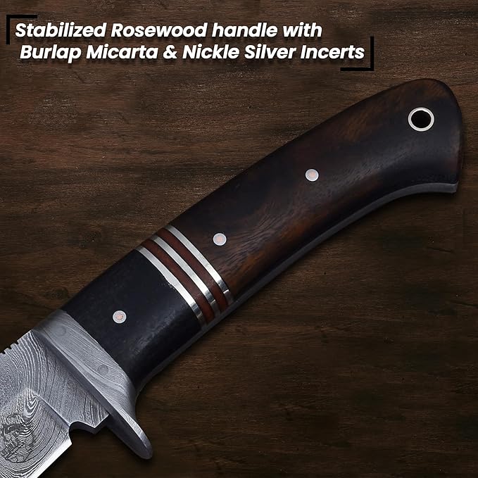 - Handle: Stabilized Rosewood with Burlap Micarta & Nickle Silver Incerts. The contours on the handle are ergonomically crafted for a very comfortable and strong grip.