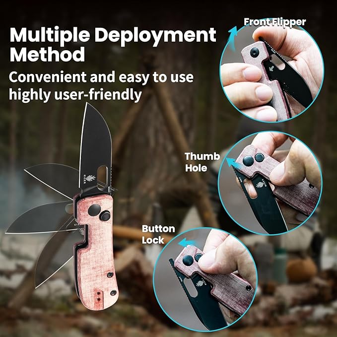 - Multiple Deployment Method: Camping folding knife - The finger hole quick-opening mechanism is convenient and easy to use, complemented by a nearly concealed front flipper, significantly saving pocket space; Button Lock Knife - The button lock design is simple to operate,allowing for one-handed use, quick and intuitive, making it very friendly for beginners.