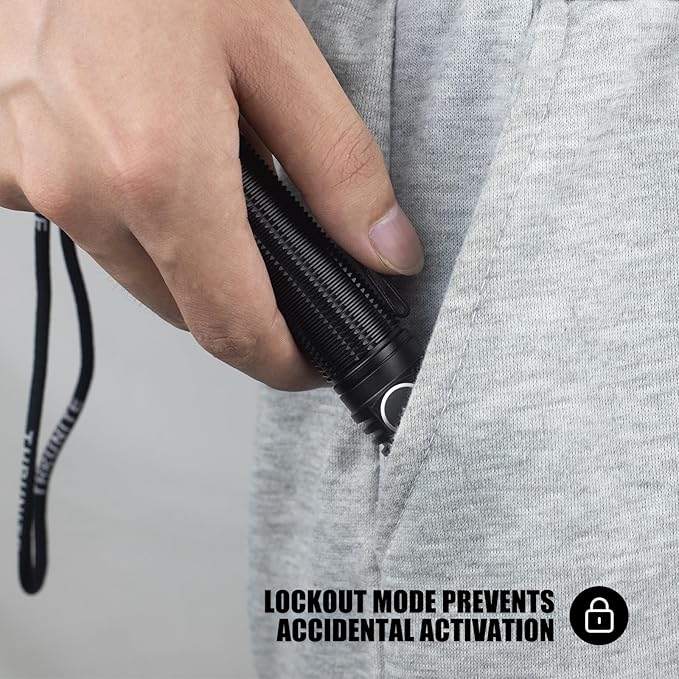 - Lock/Unlock Feature: Easily lock and unlock the flashlight. Under lockout mode, press and hold the side switch for 0.5 seconds to unlock to Firefly mode. In Firefly mode, press and hold the side switch for 0.5 seconds to re-engage the lockout mode, preventing accidental activation.