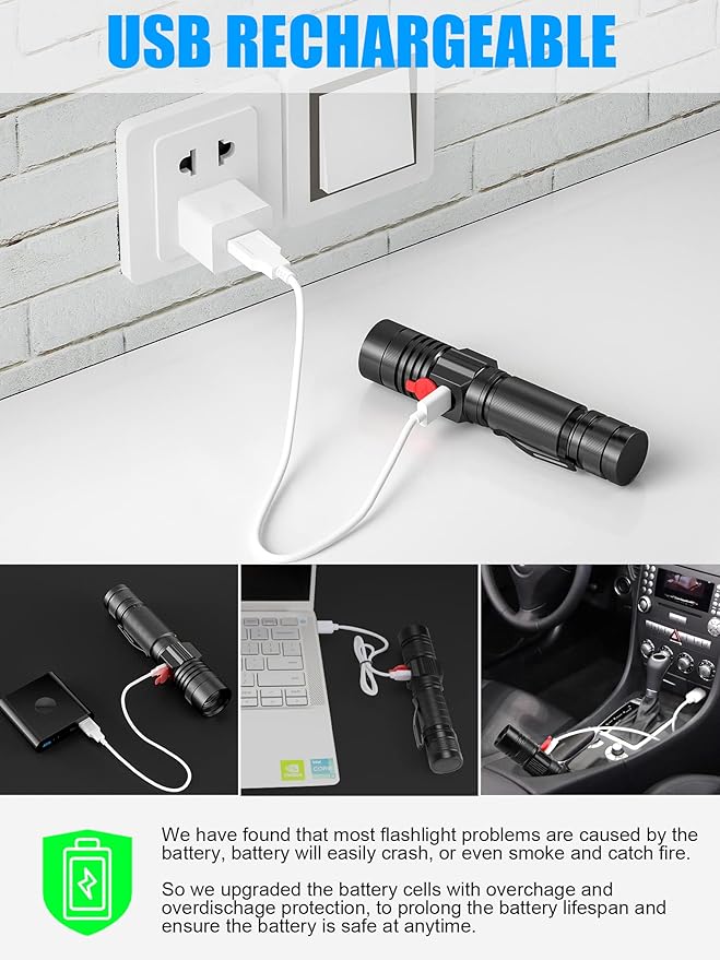 - USB Rechargeable Flashlight&Long-Lasting: Flashlight only take 3 hours to be fully charge, and provide 10hours long-lasting in low mode. You don’t have to purchase flashlight multiple times, SAVE YOUR MONEY! The flashlight is rechargeable with any USB power supply, like laptop, power bank, car charger, wall charger.