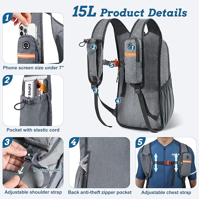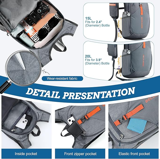 - Organized Multi-Pocket Design: With a capacity of 15L, this lightweight backpack for travel features several compartments, including a front elastic mesh pocket, a front zippered pocket, 2 water bottle holder, and a rear anti-theft zippered pocket, keeping your essentials organized and accessible.