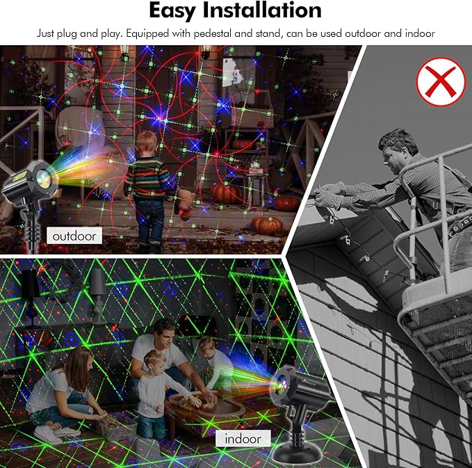 - Say goodbye to complicated setups - simply plug in and play! Our laser projector comes with a pedestal and stand for outdoor and indoor use and adjustable projection angle to achieve the best effect.