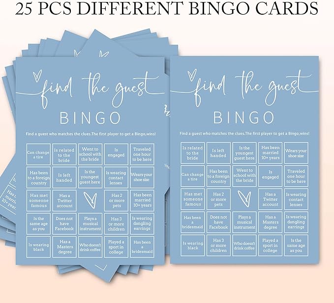 Wedding Shower Games Cards, 25Pcs Prefilled Find The Guest Bingo Game Cards, Engagement Party Games for Guests, Minimalist Blue Wedding Party Supplies - B19