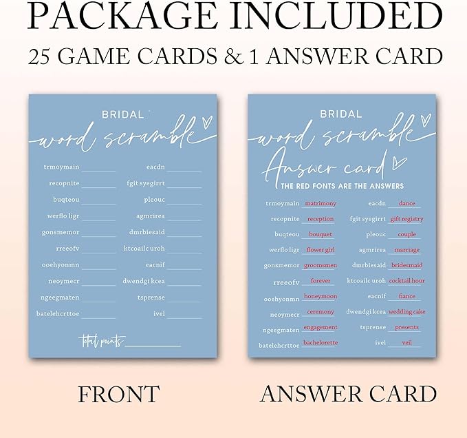 Bridal Shower Games Cards, Bridal Word Scramble, 25 Game Cards with 1 Answer Card, Engagement Party Wedding Games for Guests, Minimalist Blue Wedding Party Supplies - B14