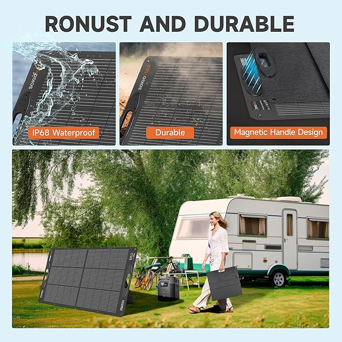 - 【Waterproof and Durable】SOKIOVOLA portable solar panels are made of advanced ETFE lamination process.SOKIOVOLA outdoor solar panels are made of Waterproof Dragon Dance Cloth,which can withstand any outdoor conditions.