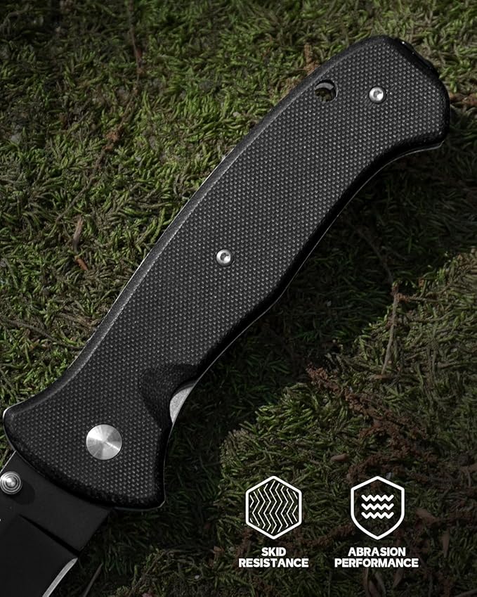 - DURABLE ERGONOMIC G10 HANDLE: Our G10 combined with stainless steel structure handle is built to brave the elements with its exceptional durability and resistance to harsh conditions. Pocket knife camping can withstand rugged terrains, extreme temperatures, and challenging tasks without showing signs of wear