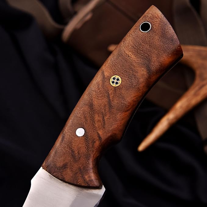 Fixed Blade Hunting Tracker Knife, Stainless Steel Blade Bushcraft Knife, Scout Carry Knives with Leather Sheath, Rosewood Handle Strong Grip, For Outdoors Hunting, Survival, Camping, Hiking Knives