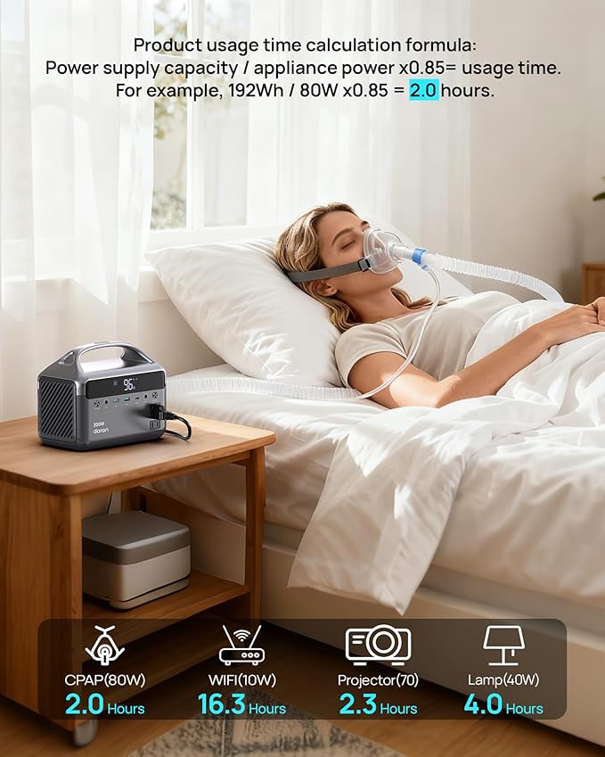 - Dependable & Powerful: Our 2025 upgraded power bank supports medicalequipment and home office equipment. For example, a30W CPAP can operate for about 5 hours (192Whx*0.85 conversionrate/30W=5.44 hours). Similarly, if your device is a 150W stew pot, then(192Whx0.85 conversion rate/150W=1.08 hours). The 300w powersupply does not support high-power products such as coffee machines.(Only suitable for powering devices within 300W).
