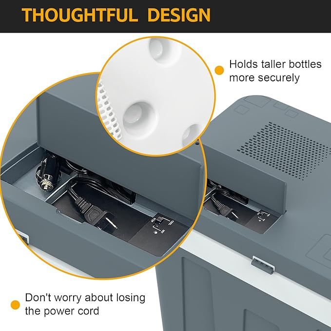 - 【Mobile Design & Anti-Shake Shock】The portable refrigerator is designed for outdoor easy mobility, equipped with double handles and wheels to reduce your burden and easy to carry. Meanwhile, the grooves on the lid of the portable refrigerator can securely hold the tall bottles. The car cooler is designed with silent and anti-shock design, and the non-slip base is designed to run at a 30-degree angle.