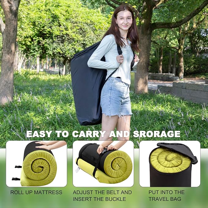 - Portable Comfort: Travel bag and pillow included. This portable mattress comes with two straps for easy roll-up or fold-out, fitting compactly into the included travel bag, which saves space and is easy to carry, it includes a pillow for added comfort. Available in multiple sizes (Cot: 72x24x3”, Single: 75x30x3”, Twin: 75x38x3”), it caters to various needs and preferences, making it an excellent choice for any sleeping arrangement