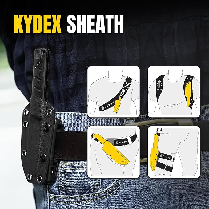 - Everyday Carry Knife: The perfect all-in-one pocket knife for outdoor enthusiasts. kizer knife with the Kydex sheath, you can retain this sharpness for longer. Multiple carrying methods, lanyard hole and high-strength lightweight kydex material sheath for easy portability