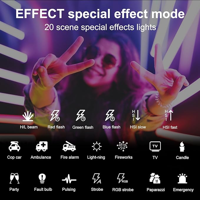 - 【20 Scene Modes & Full Adjustability】Equipped with 20 versatile lighting effects including Cop car, ambulance, fireworks, TV, candle, strobe, and RGB strobe, this photography light adapts to any scene. Enjoy precise control with brightness adjustable from 0% to 100% and color temperature switching from 2500K (warm) to 9000K (cold) for perfect shot customization.