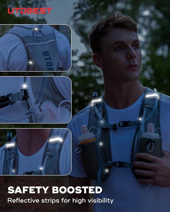 - 0.5 LB ONLY with TUBE BUCKLE: UTOBEST hydration pack is incredibly light, nearly weightless, you don’t even notice there is a running water vest on your back. Tube buckle design secures your water tube, ensuring stability and focus during movement