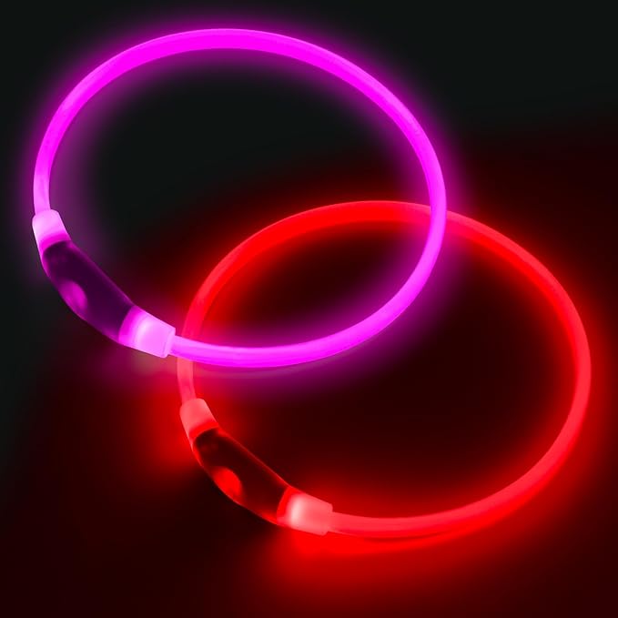 2 Packs Light Up Dog Collar, LED Dog Collar, USB Rechargeable Dog Lights for Night Walking, Adjustable Glow in The Dark Collars for Small Medium Large Dogs, Waterproof Safety Pets Lights Red&Pink