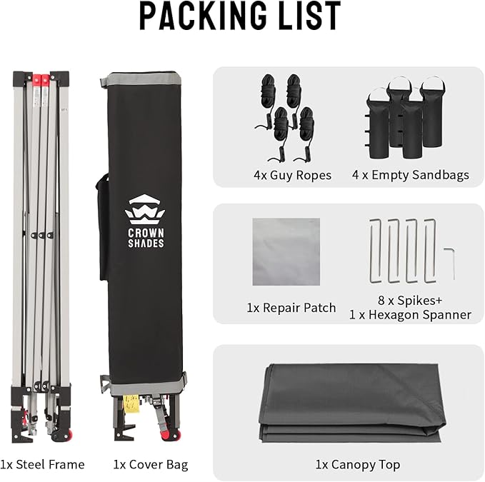 - HIGH GRADE STEEL FRAME - The durable, high-grade, corrosion-resistant steel truss frame with hardened through bolts comes pre-assembled and can be set up without any tools. Engineered to support up to 120 lbs. distributed across the frame, it ensures robust and reliable performance. The extended ceiling assembly and upgraded high peak design make it easier for rainwater to run off, preventing water pooling on the canopy. Perfect for extended outdoor use at markets, festivals, and exhibitions