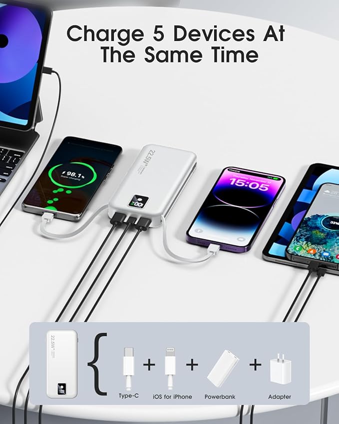- 【Wide compatibility with built-in cable】: The portable battery charger uses a built-in charging cable for charging and is compatible with iphones, Android devices, and tablets. You don't need to use an additional cable, just use the built-in charging cable to connect to your device for fast charging. You can also use the USB-A and USB-C ports to charge your device. Can charge up to 5 devices at the same time.