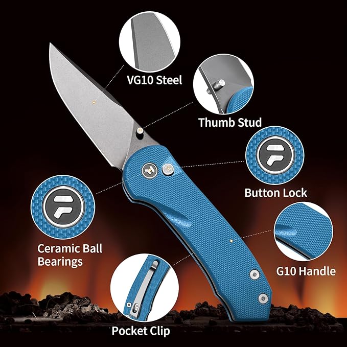 - Premium VG10 Steel: Our pocket knife features excellent hardness and outstanding wear resistance. Its durable blade reduces the frequency of sharpening, providing longer cutting performance for all your needs