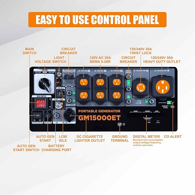 - 【Tri - Fuel Capability, Effortless Start - Up】 Adaptable to diverse settings and user inclinations, the GM15000ET is engineered with tri - fuel compatibility, enabling seamless transitions between gasoline, LPG, and natural gas. This flexibility ensures reliable power sources for various scenarios. Moreover, it offers a trifecta of start - up options: one - button start for instant ignition, remote start for added convenience, and recoil - start as a reliable backup. This comprehensive start - up system guarantees swift power activation, regardless of the circumstances. With such simplified operation, users can effortlessly take charge of their power needs.