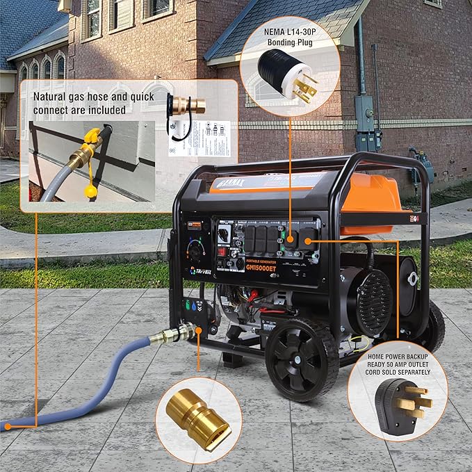 GENMAX 15000W Tri-Fuel Portable Generator - 2025 Model with ATS, CO Sensor, Digital Display & 50A Output Perfect for Home Backup, Construction Sites & Emergency Power (GM15000ET)