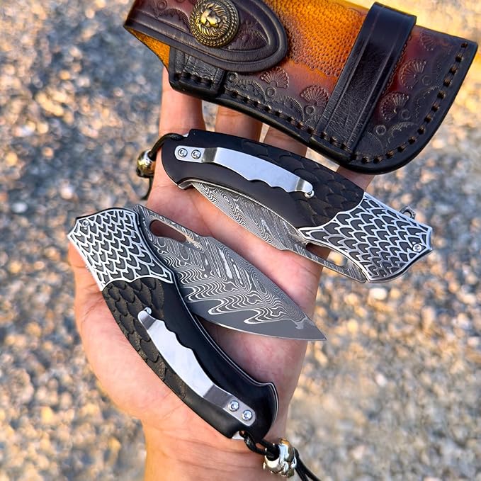 Quality pocket knives for men and women,Damascus Steel Pocket Folding Knife,With leather sheath, Ebony Handle,Engraved feather pattern,Outdoor camping, EDC carrying adventure, Hiking trip, gift