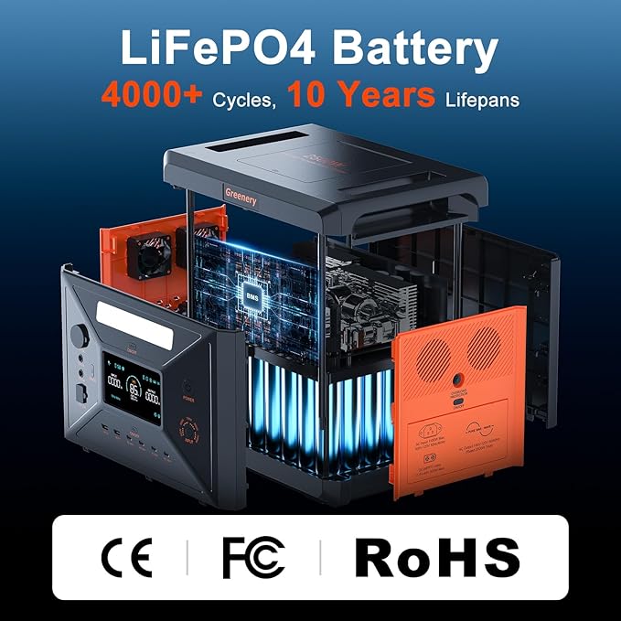 - 【2304Wh Mega Capacity & 5000W Peak Power】Greenery portable power station delivers 2500W continuous/5000W surge power with 2304Wh LiFePO4 battery (3000+ cycles). Powers 99% appliances including refrigerators (8hrs+) and medical devices during blackouts. 23% lighter than competitors at 47.6 lbs with ergonomic handles.