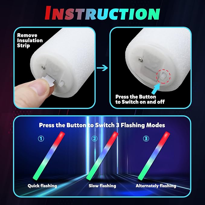 - 【Three Colorful Flashing Modes】: One of the most exciting features of light up foam sticks are their ability to display three different glowing patterns: fast flashing, slow flashing, and alternating flashing. These patterns can create a dynamic and eye-catching effect that is sure to impress your guests. With the ability to switch between patterns, you can customize the experience and create a unique ambiance that is perfect for your event.