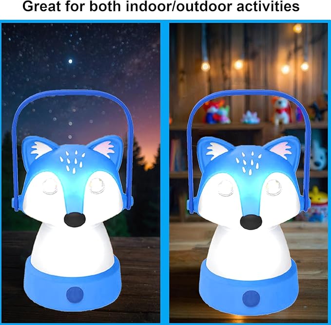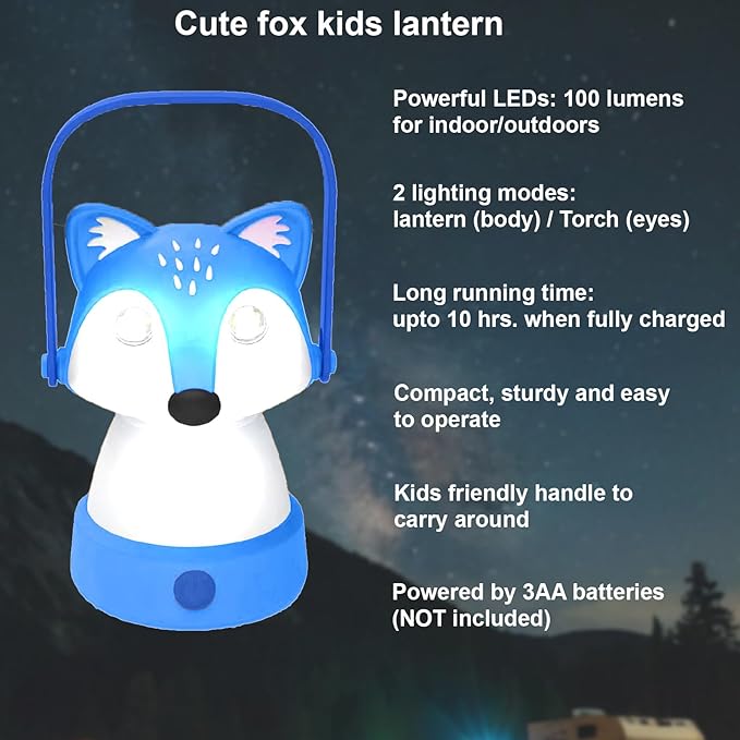 - CUTE FOX LED LANTERNS FOR KIDS: Powered by 3 AA batteries (not included), this adorable kids' camping lantern delivers 100 lumens of brightness and runs for up to 10 hours. Compact, sturdy, and easy to carry, it features two fun light modes: lantern (from the fox's body) and torch (from the fox's eyes). The belly button serves as the power switch—press it to toggle between modes and let the little ones enjoy the fun!
