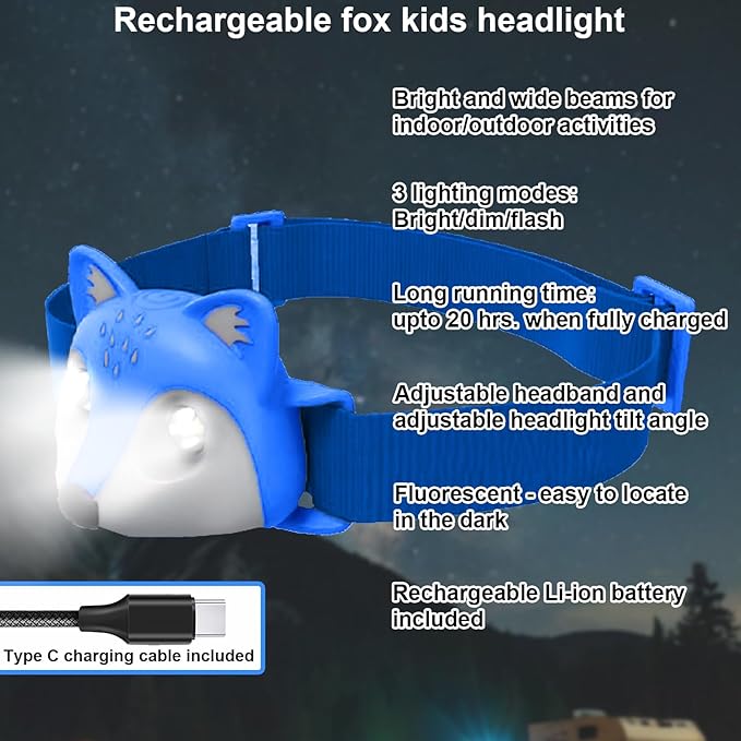 - RECHARGEABLE KIDS HEADLIGHT/FLASHLIGHT FOR CAMPING: The matching kids' headlamp provides bright, wide beams, perfect for both indoor and outdoor activities. Equipped with a rechargeable Li-ion battery and a charging cable, a full charge lasts up to 20 hours. It features three light modes: bright, dim, and flash. The fluorescent design makes it easy to locate (the little one) in the dark, and the adjustable headband and tilting light angle offer added flexibility and convenience!