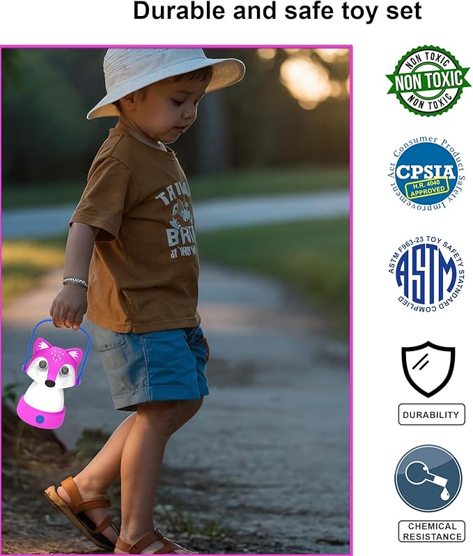 - GREAT FOR BOTH INDOOR/OUTDOOR ACTIVITIES: With its compact design, portability, lightweight build, and bright beams, this toy set is not only perfect camping essentials for kids and toddlers, but also serves as a great indoor table lamp, night light (rechargeable!), and flashlight. It makes a fantastic gift for Christmas, Halloween, or birthdays—your kids will love it!