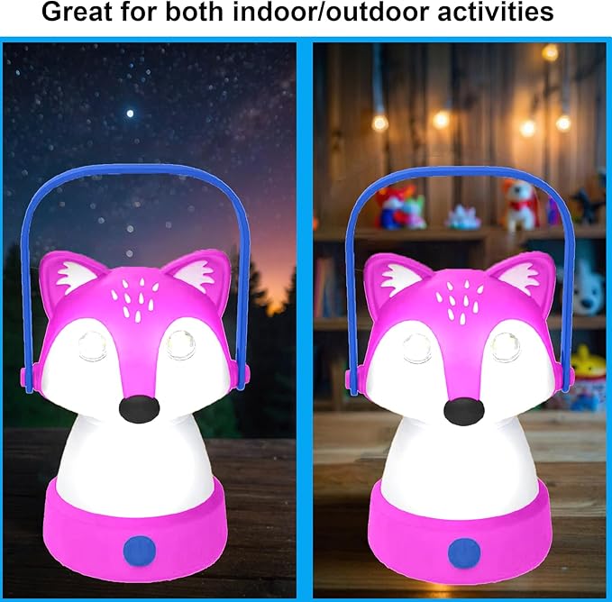 - CUTE FOX LED LANTERNS FOR KIDS: Powered by 3 AA batteries (not included), this adorable kids' camping lantern delivers 100 lumens of brightness and runs for up to 10 hours. Compact, sturdy, and easy to carry, it features two fun light modes: lantern (from the fox's body) and torch (from the fox's eyes). The belly button serves as the power switch—press it to toggle between modes and let the little ones enjoy the fun!