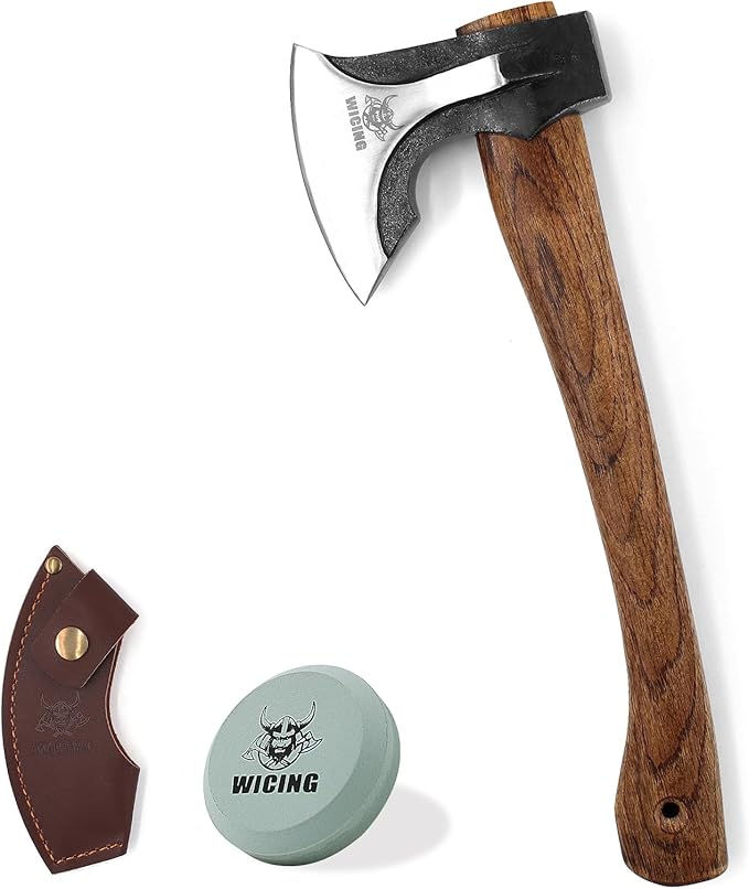 Camping Hatchet, 14.2-inch Splitting Axe with Leather Sheath, Chopping Axe 1065 High Manganese Steel and Hickory Handle