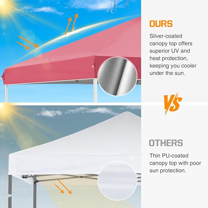 - PREMIUM STEEL FRAME WITH WEIGHT BAGS: Built to perform, the heavy duty canopy frame is made of high-grade, powder-coated steel and secured with hardened through-bolts for superior strength and rust resistance. Whether you’re using it as a canopy tent for events or a pop up tent for shade on the go, the included set of 4 weight bags helps anchor your setup for added stability in outdoor conditions
