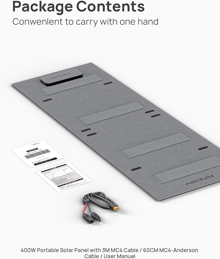 - Eco-Friendly and Sustainable Energy Solution:Harness clean, renewable solar power with the AFERIY 400W solar panel—an environmentally conscious choice for sustainable energy on the go. Package includes a foldable solar panel, MC4 to Anderson cable, and user manual.