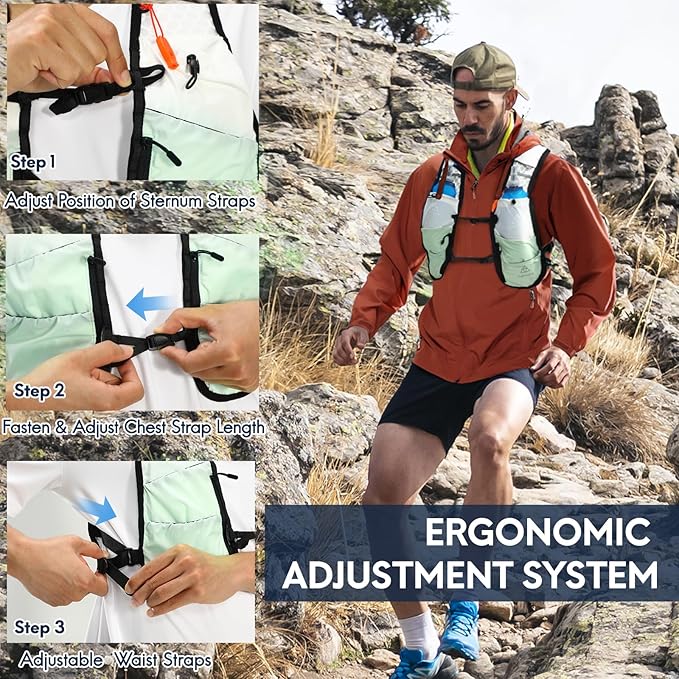 - ERGONOMIC ADJUSTMENT SYSTEM: Running vest provides an ergonomic adjustment system that allows you to adjust the position of sternum straps quickly. Adjustable waist straps can adjust the tightness according to different body shapes. This flexible design keeps runners breathing freely and moving without restraint during exercise